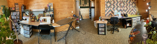 The girls' bedrooms haven't been taken over, BUT the loft area was cleared of most items and transformed into my sewing/crafting space. Standing atop the staircase, the panoramic showcases most of the setup.
